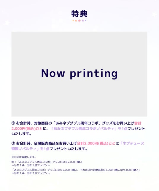 1.お会計時、対象商品の「あみネプダブル周年コラボ」グッズをお買い上げ合計2,000円(税込)ごとに、「あみネプダブル周年コラボノベルティ」を1点プレゼントいたします。