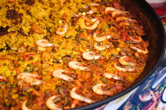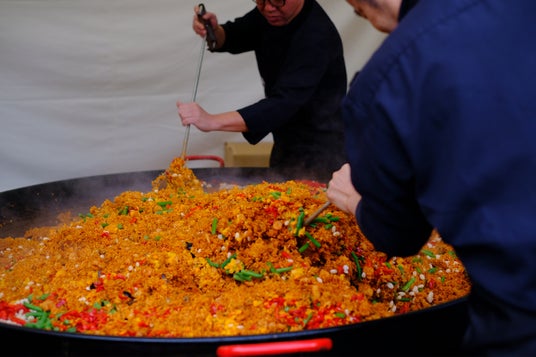 大鍋から直接取り分けられる、熱々のパエリア。