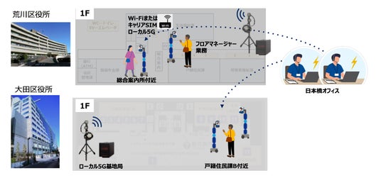 この試みは、各区役所内に構築されたローカル5Gによる大容量・低遅延の安定した通信基盤を活用することで、遠隔地のオペレーターが2つの自治体のnewmeを操作し、場所にとらわれずに質の高いサービスを提供する、持続可能な行政運営の新たなBPOモデルを構築するものです。