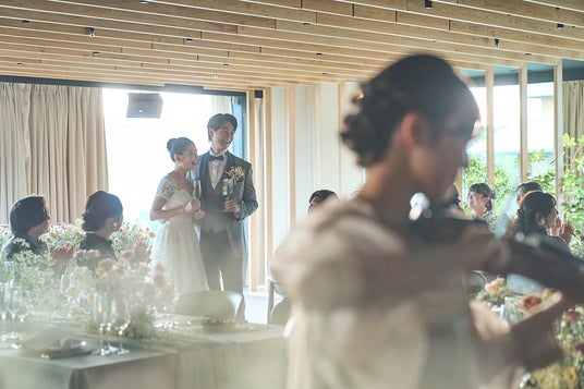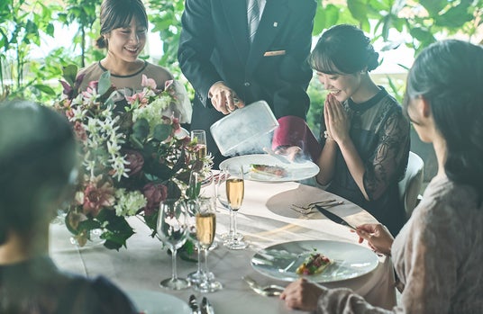 ライブ感あふれるキッチンでは、できたてのお料理とともに、ゲスト一人ひとりの記憶に残る体験をご提供。シンプルでありながら遊び心を感じさせる演出が、おふたりの個性を自然に引き立てます。