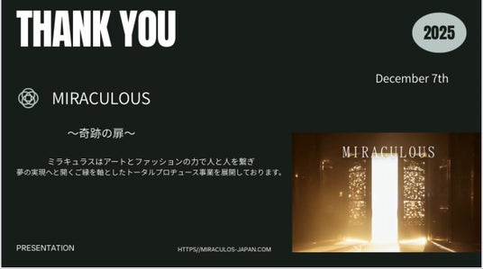 Art x Fashion x Music and Support for Women Miraculous aims to create new value by fusing technology with art, fashion, and music! At the same time, we provide multifaceted support so that women can shine with their individuality and talents and become independent and soar in society.