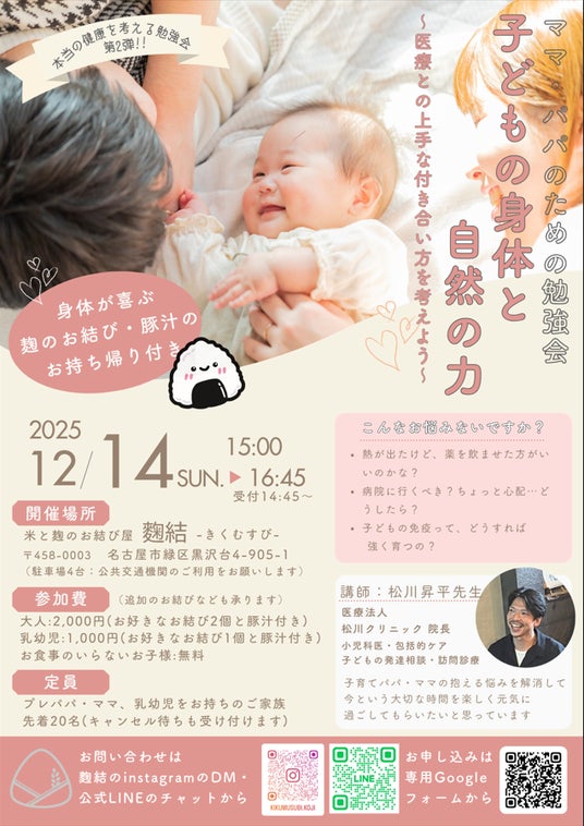 地域の親子が安心して暮らすために──名古屋市天白区「松川クリニック」松川昇平先生による勉強会を12月14日(日)に開催。麹たっぷりおむすび&豚汁付き、家庭で学びを共有できるひと時を。