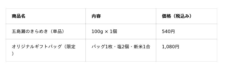 本イベントでは、商品を実際に味わっていただける3種の試食メニューをご用意。「まろやかな塩味」「後味の甘み」「素材を引き立てる深み」など、塩そのものの魅力を体感できます。また、レシピ付きリーフレットの配布や、ギフトにぴったりな限定セットの販売も行います。