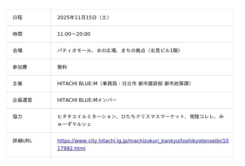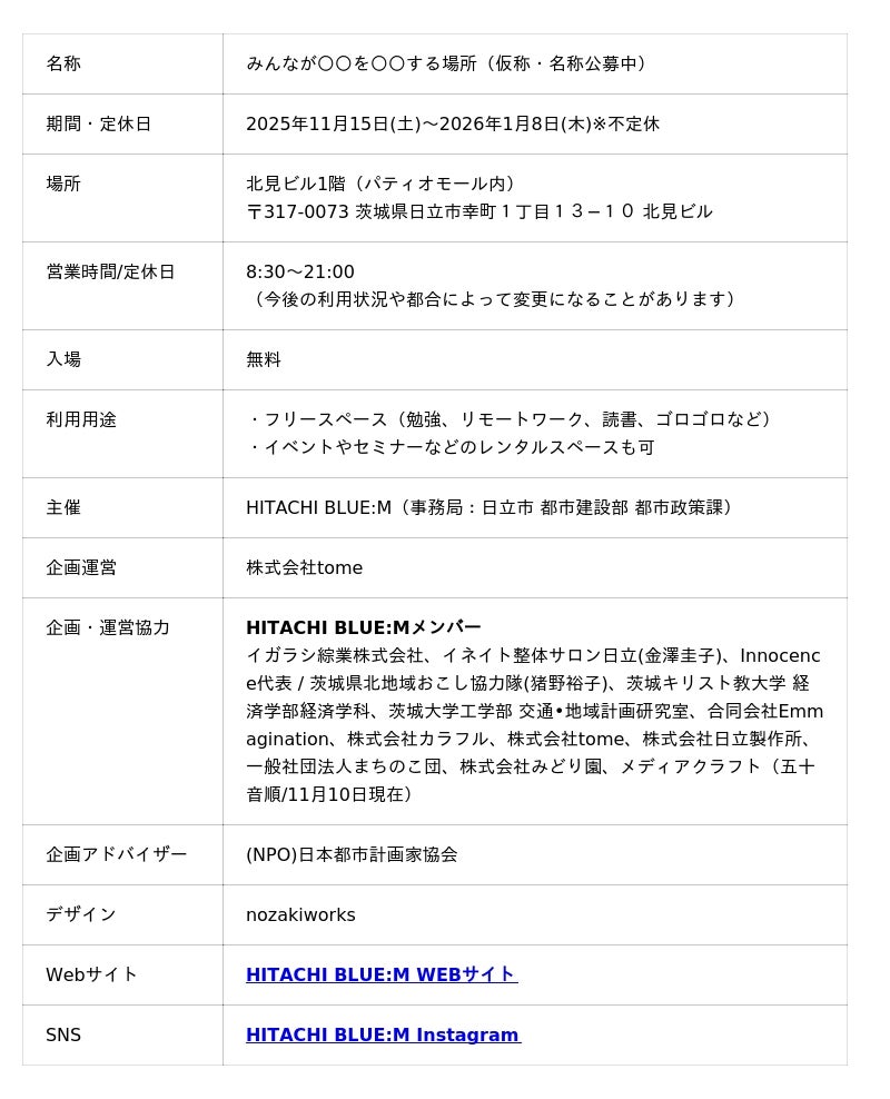 その第2回社会実験として、2025年11月15日(土)に「HITACHI BLUE:M STREET PARK(ヒタチブルーム ストリートパーク)」を開催。当日、パティオモールの空き店舗や公共空間を活かした“みんなでつくる実験の場”となるまちの拠点もオープンします。