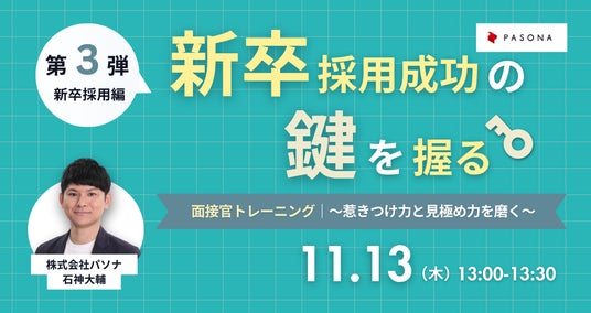 株式会社パソナ(本社:東京都千代田区、代表取締役社長 中尾慎太郎)は、経営層や人事・採用担当者を対象にしたウェビナー「新卒採用成功の鍵を握る!面接官トレーニング~惹きつけ力と見極め力を磨く~」を、11月13日(木)に開催いたします。
