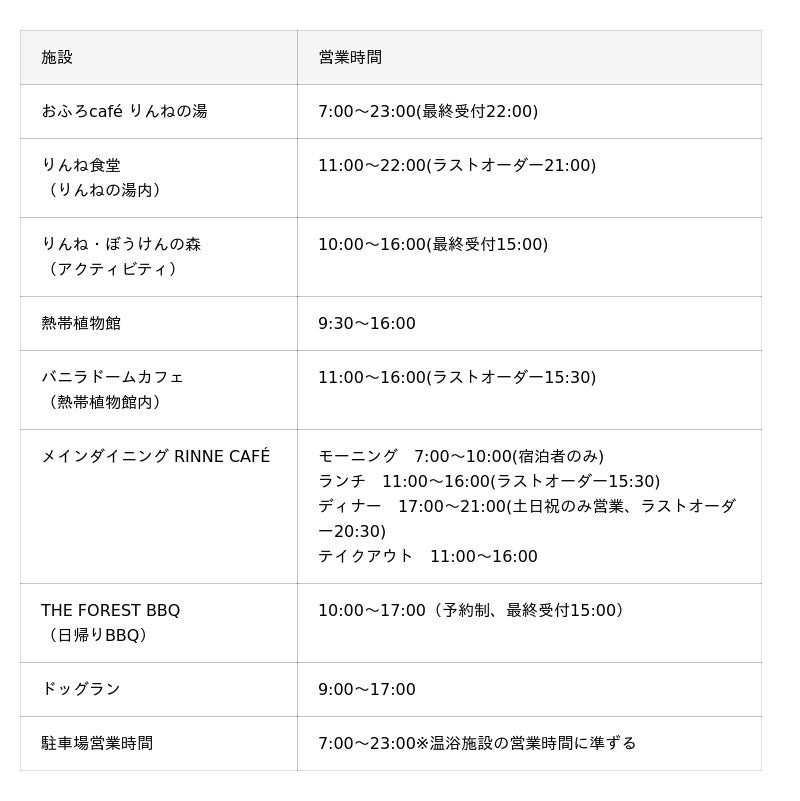 各施設の営業時間は以下となります。グランドオープン日のみ全施設12時からとなります。