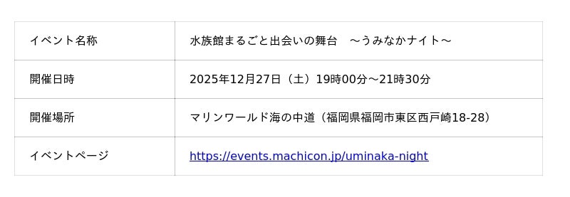 株式会社リンクバル(本社:東京都中央区、代表取締役社長:吉弘和正、証券コード:6046、以下「リンクバル」)が運営するイベントECサイト「machicon JAPAN」は、2025年12月27日に福岡県の「マリンワールド海の中道」にて最大1,200名規模で開催される【水族館まるごと出会いの舞台~うみなかナイト~、以下「本イベント」】の掲載を開始いたしました。
