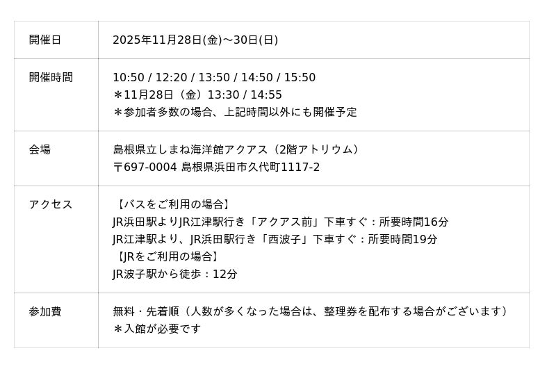 2025年11月28日(金)~30日(日) <開催場所:島根県立しまね海洋館アクアス 2階アトリウム>