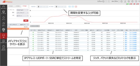 東陽テクニカ製「SYNESIS」は、ネットワーク上の400Gbps(毎秒400ギガビット)のデータを取りこぼしなくキャプチャできる高性能パケットキャプチャ装置です。このたび、音声や動画の伝送に用いられるプロトコル「RTP(Realtime Transport Protocol)」におけるジッタ(パケットの到着時間のばらつき)やパケットロスを、送信元と宛先のペア(ストリーム)単位で測定する機能を実装しました。この機能により、従来は目視判断に頼っていた映像・音声品質をリアルタイムで定量的に評価でき、障害の早期検知と原因特定が迅速に行えます。また、長期間キャプチャしたデータを活用して、障害の再現検証を行うことで、障害対応の時間短縮やコスト削減に寄与します。