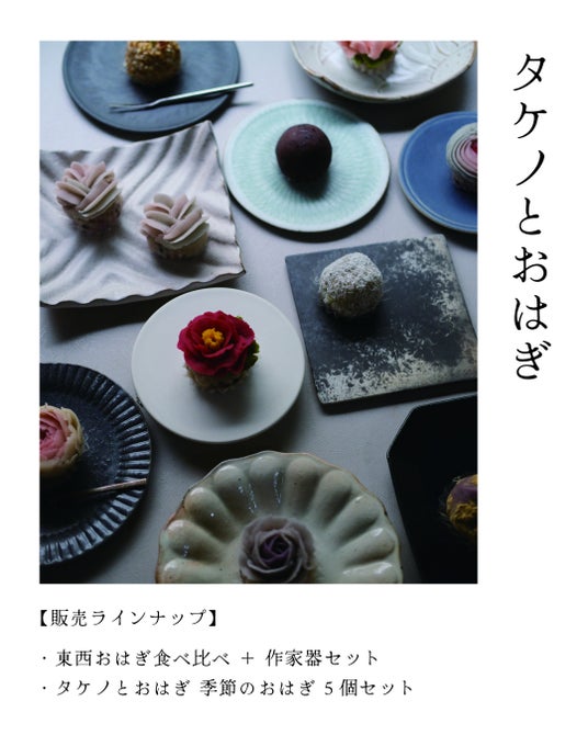 今回のイベントでは、普段京都では出店のない2つの名店おはぎを食べ比べをひとつの器にのせて楽しむ贅沢なセット「東西おはぎ食べ比べ+作家器セット」および、【タケノとおはぎ】の季節限定おはぎ5個セットを事前予約制・数量限定で販売。2025年11月24日(月)、京都・岡崎の「nokaze -うつわと物語の家-」にてお渡しします。