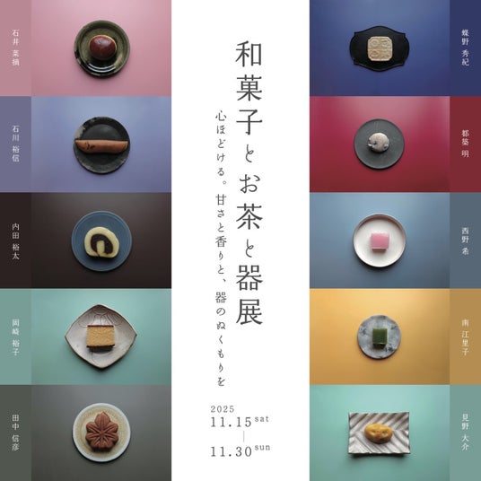 2025年11月15日(土)より全国の和菓子に合う器作家の作品とお茶の名店が集まる「和菓子とお茶と器展」も同時開催します。全国の陶芸作家による器、香り高い日本茶、薬草茶ブランドが一堂に集まります。「煎茶堂東京」「ISSO」「GOOD TIMING TEA」など注目ブランドのお茶と、などの人気作家による器が並び、和菓子・お茶・器が織りなす“和の世界”を五感で体験できる特別企画展です。