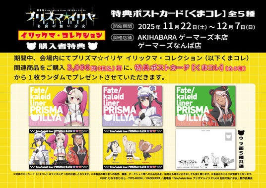 期間中、会場内にてプリズマ☆イリヤ イリックマ・コレクション関連商品をご購入3,000円(税込)毎に、特典ポストカード【くまコレ】(全5種)から1枚ランダムでプレゼントさせていただきます。