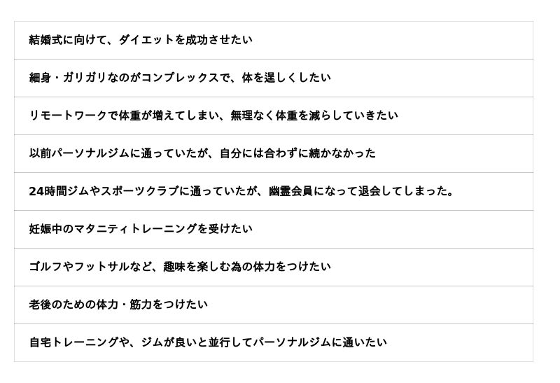 それ以来【地域密着型のパーソナルジムとして周辺エリアの住民の皆様に愛され、全ての方が継続できるトレーニング】を提供する事をモットーに、ダイエットやボディメイク、マタニティトレーニング、健康増進、運動習慣を身につける為のサポートをさせて頂くパーソナルジムです。