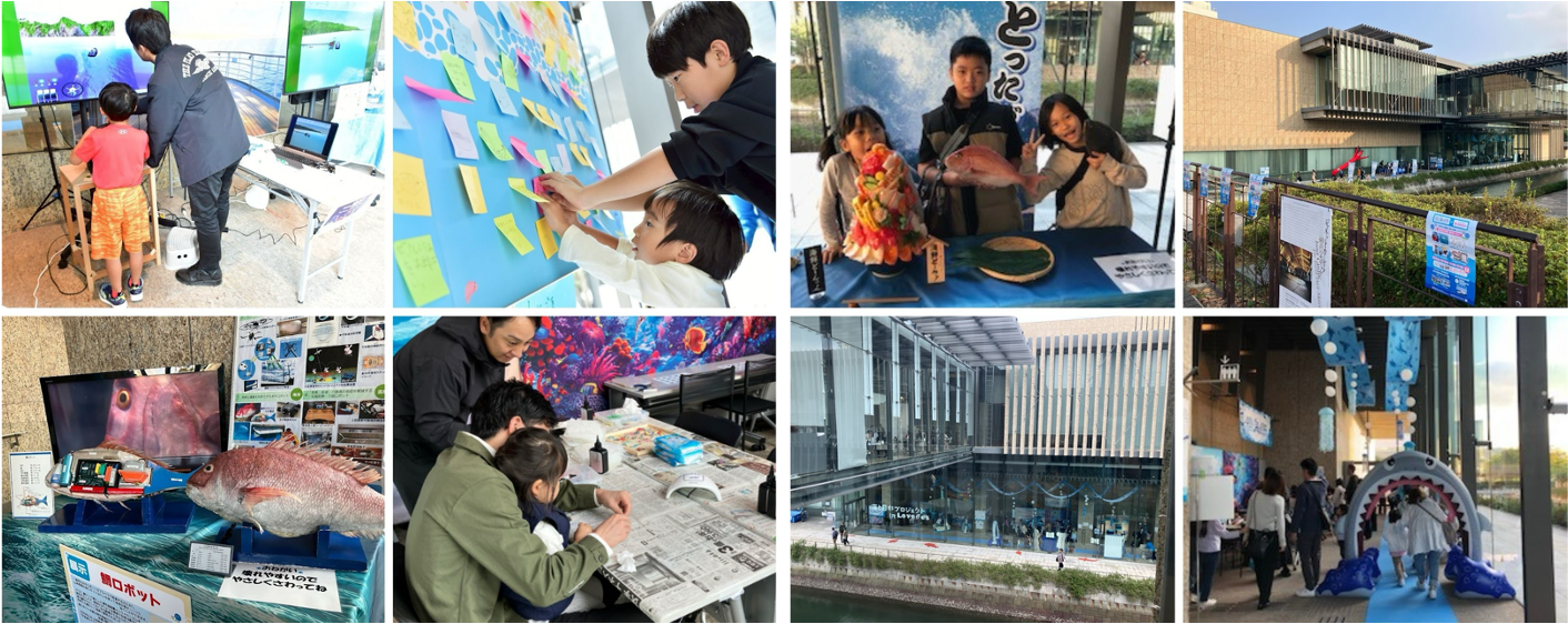 2日目は、初日の参加者の再訪が多数見られ、体験ブースには予約が殺到。イベントの質と満足度の高さが来場者増につながりました。美術館では水中ドローン体験やユニークな海洋ロボットの展示、海洋プラスチックごみを活用したキーホルダー作りが行われ、長崎水辺の森公園の岸壁では、巨大SUP、電動船の乗船体験などが引き続き行われました。ブースによっては事前の予約で満席となる時間帯も多く、中でも回収された海洋プラスチックごみを用いたキーホルダー作りのワークショップは、遊びを通して環境問題を学ぶ機会として好評を博し、終日満席となりました。また、長崎大学が開発した本物そっくりの鯛ロボットや、宇宙にいったエイロボット、自分で動く海洋調査ロボットの展示コーナーでは、大学で研究してる学生スタッフに、来場者からの質問が相次ぎました。ロボットを興味津々で見ていた人たちは、最先端の科学技術に驚いていました。また、操船シミュレーターでの船の操縦体験ができるコーナーでは、船について学んでいる長崎総合科学大学の学生スタッフが操作方法を丁寧に教えてくれることもあり、リピーターが続出、ここから未来の船長が誕生するかも、と感じられるような熱狂ぶりでした。そのほか、海の幸の食品サンプルのフォトコーナー、きらきら輝く海のアートコーナー、デジタルスタンプラリー、長崎大学水産学部を舞台にした漫画「第九の波濤」の展示、小学生の海体験学習の成果物展示、九州沖縄各県の海と日本プロジェクトのコラボアイテムの紹介、などなど盛りだくさんの内容で大いに賑わいました。そして、”長崎の海を守るために”というテーマで書いてもらったメッセージボードには、来場者の海への深い愛と関心を示すメッセージで埋め尽くされました。参加した人たちは、2日間を通して、より海への興味関心が高まり、長崎の海への愛も深まったようです。海と日本プロジェクトinながさきは、今後もイベントを通して、長崎の豊かな海を次世代へ引き継ぐためのアクションを積極的に展開していきます。