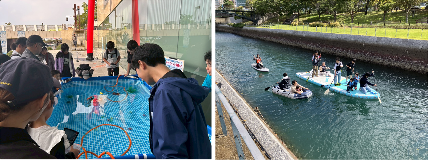 長崎県美術館の運河ギャラリーでは、特に先端技術を活用した参加型コンテンツが高い人気を集めました。水中ドローンを使った宝探し体験では、参加者がドローンを操縦し、プールの底にあるカプセルを器用に引き上げると歓声が上がり、未来の海洋産業を担うテクノロジーに触れる絶好の機会となりました。また、巨大SUP(スタンドアップパドル)体験、高校生が製作した電動船の操作体験、そして海洋ごみを使ったキーホルダー作りワークショップも実施されていて、子どもも大人も夢中でチャレンジしていました。この日は、夕方まで水辺の森公園側でも Lovefesのステージイベントや花火が控えていたため、イベントの賑わいが終了時間まで続きました。