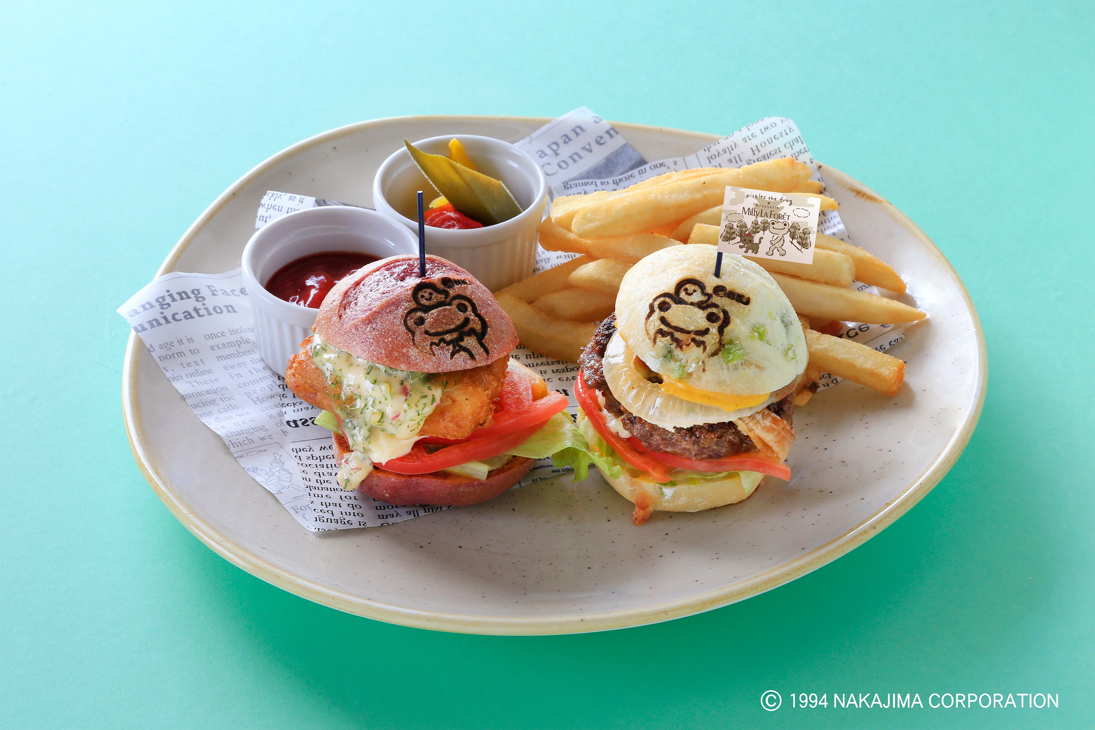 ブラスリー ミリーラ・フォーレでは今回初めてかえるのピクルスとのコラボレーションを行い、2種のメニューをご用意いたします。ピクルスの顔型焼印入りバンズのバーガー2種とスープ、そして特典の缶バッジが付いた『コラボバーガーセット』は、国産牛100%ビーフパティをえだまめフォカッチャで挟んだミニバーガーと、カシスやフランボワーズのピューレを練り込んだパンで白身魚フライを挟んだミニバーガーの2種をご用意。また特典のコースター付き『コラボケーキセット』は、ホテルパティシエが作るショートケーキやモンブランなど7種からお選びいただけるケーキを、日本庭園をイメージした和テイストのプレートでご提供いたします。