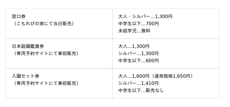 公園入園料 大人(高校生以上)450円・シルバー(65歳以上)210円・中学生以下無料