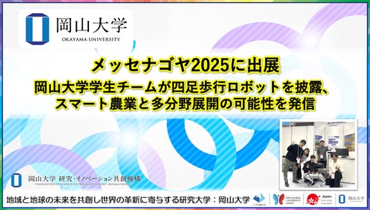 国立大学法人岡山大学(本部:岡山市北区、学長:那須保友)は2025年11月6、7日、ポートメッセなごやで開催された日本最大級の異業種交流展示会「メッセナゴヤ2025」に株式会社TIMEWELLと共同で出展し、四足歩行ロボットを活用したスマート農業の取り組みを紹介しました。本出展は、本学が推進する地域中核大学イノベーション創出環境強化事業における「シンク&アクションタンク構想」の一環として実施したものです。
