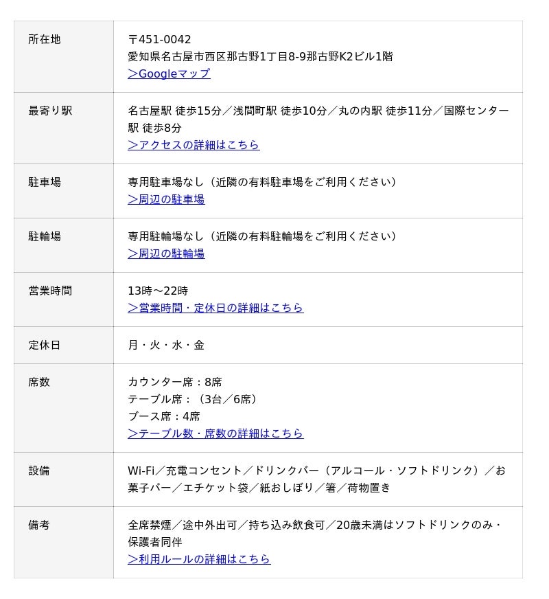 円頓寺商店街・国際センター駅・浅間町・丸の内・名駅から徒歩圏内で、予定の合間に寄りやすい立地です。移動の途中で「少し時間を使いたい」ときに便利です。