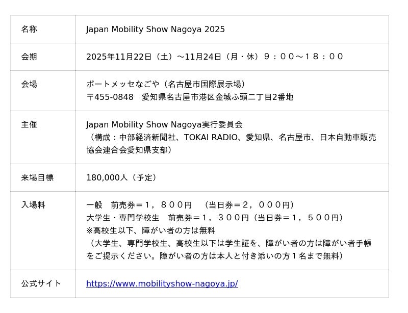Japan Mobility Show Nagoya実行委員会(構成:中部経済新聞社、TOKAI RADIO、愛知県、名古屋市、日本自動車販売協会連合会愛知県支部)は、「Japan Mobility Show Nagoya 2025」を11月22日(土)から24日(月・休)まで、ポートメッセなごや(名古屋市港区)で開催します。