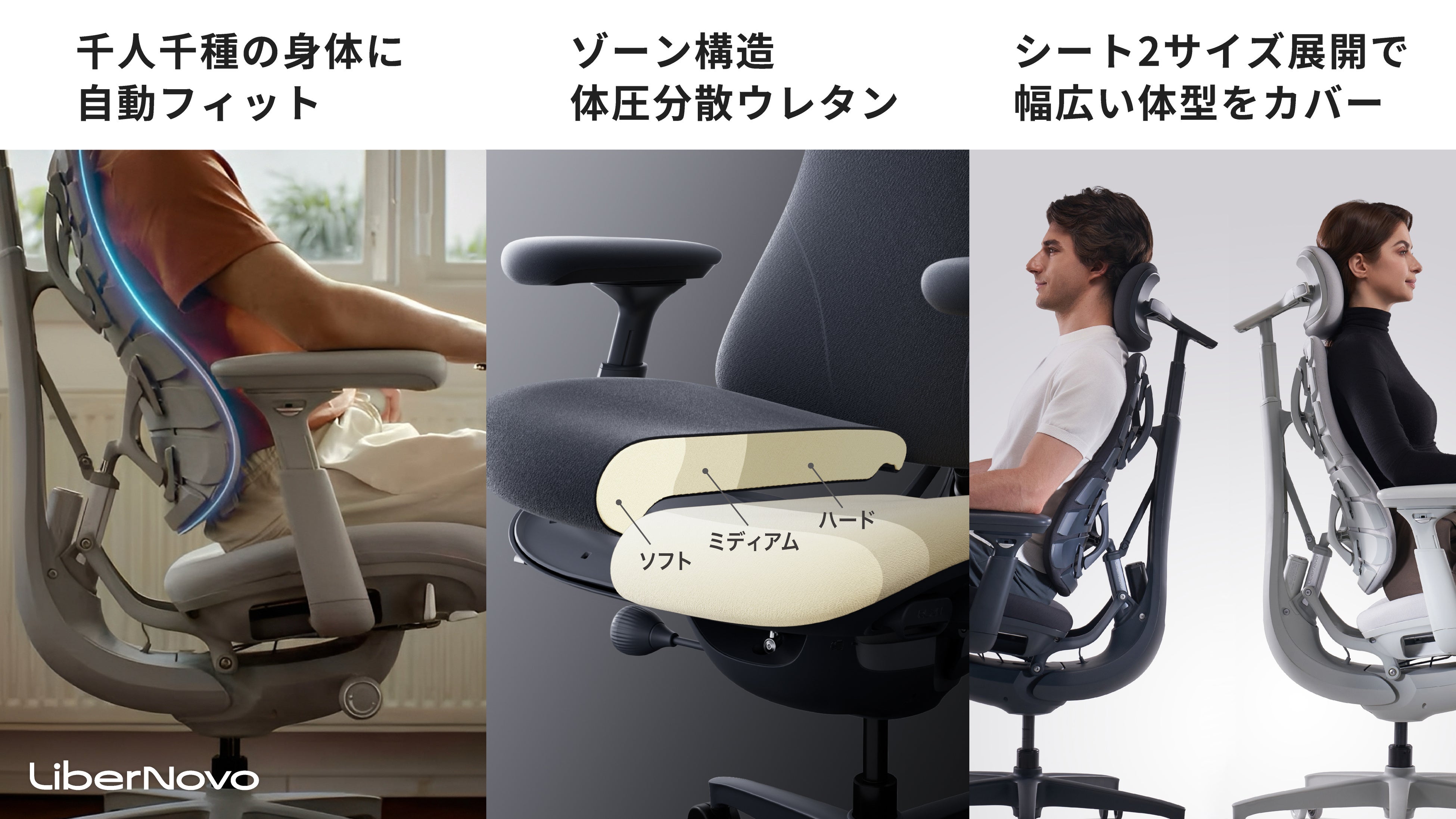 LiberNovoが2,924人を対象に実施した「ワークチェアの認知度および消費者需要に関するアンケート調査」では、「長時間デスクワークによる不調を感じやすい部位」に関する回答は“腰”、“首”、“背中”、「チェア選びの際気にしている点」の回答では“シート(座面)の座り心地”、“ランバーサポート(腰部)のサポート力、フィット感”、“自身の身長及び体型に合うか”が上位に挙げられていました。LiberNovo Omniはこのような需要に対して、