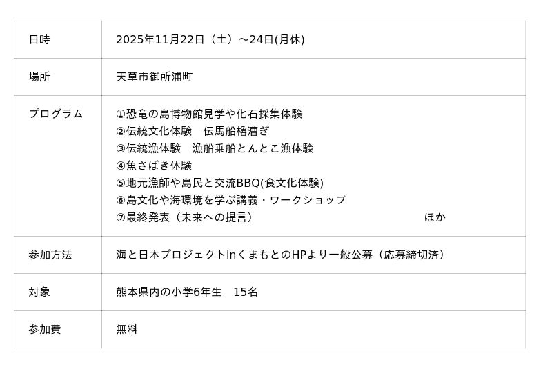 一般社団法人くまもと海のミライは、天草市御所浦にて「御所浦で離島を学ぶ 離島のミライ発掘隊」を11月22日(土)~24日(月休)に開催いたします。このイベントは、次世代へ豊かで美しい海を引き継ぐために、海を介して人と人とがつながる“日本財団「海と日本プロジェクト」”の一環として開催いたします。