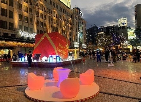 広さ約6,000平方メートルの広場東側には、高さ約4メートルのシンボリックなプレゼントボックス型モニュメントを今年も設置。さらに、来街者の憩いの場として、常設のイスとテーブルに加え、光るイスとテーブルを広場内3カ所に設置し、上質な空間演出を行います。
