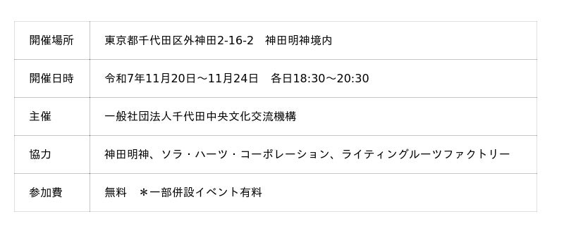 令和7年11月20日より開催「神田明神 光彩絵巻 ~光が彩る日本文化~」一般社団法人千代田中央文化交流推進機構主催