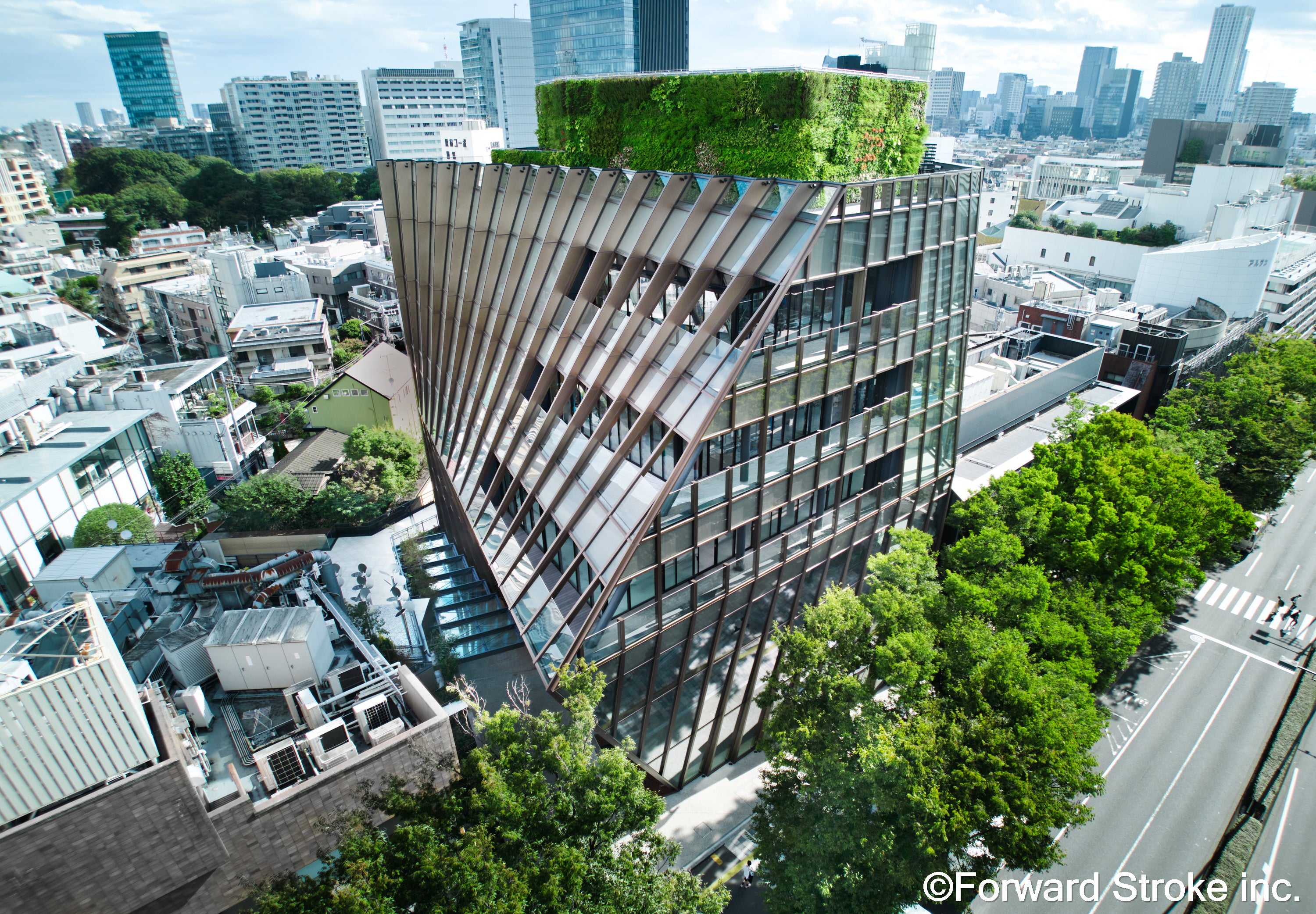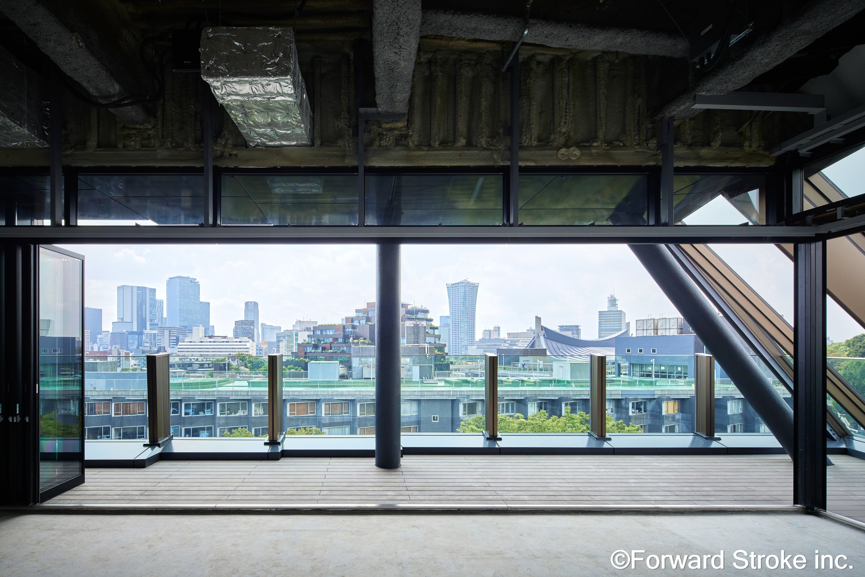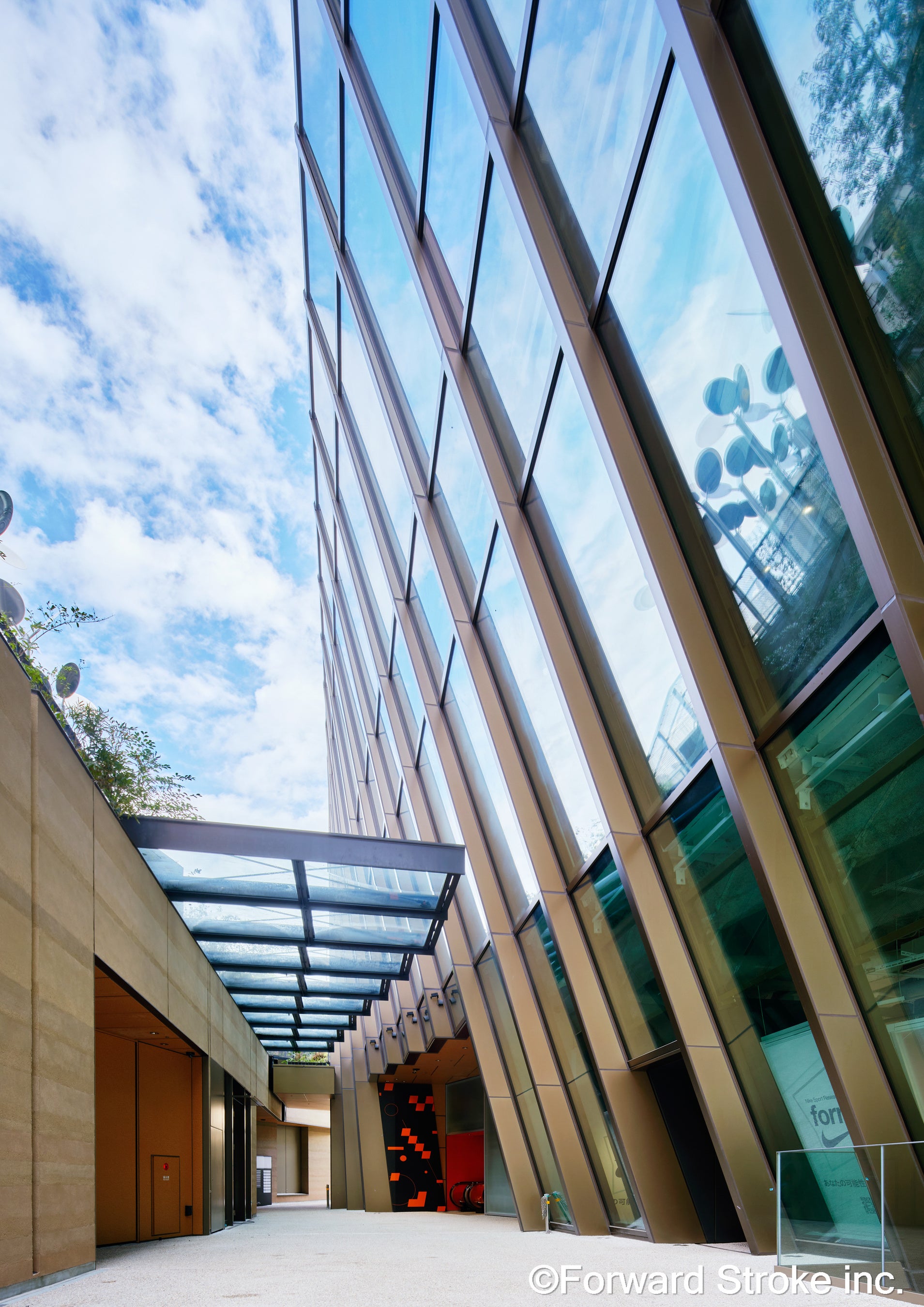 けやき並木や歩道の広さなど都市的アイデンティティが確立されている表参道側には、けやき並木の列を意識した縦基調のガラスファサードを採用しています。