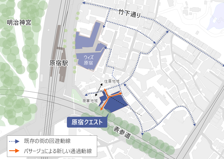 本プロジェクトは、1988年の開業以来、原宿カルチャーとともに歩んできた旧「原宿クエスト」の歴史と精神を受け継ぎ、新たに生まれ変わらせるものです。隣接するエリアには2020年にNTT都市開発が手掛けた「ウィズ原宿」が開業し、原宿駅前から竹下通り方面へ新しい人の流れが生まれました。