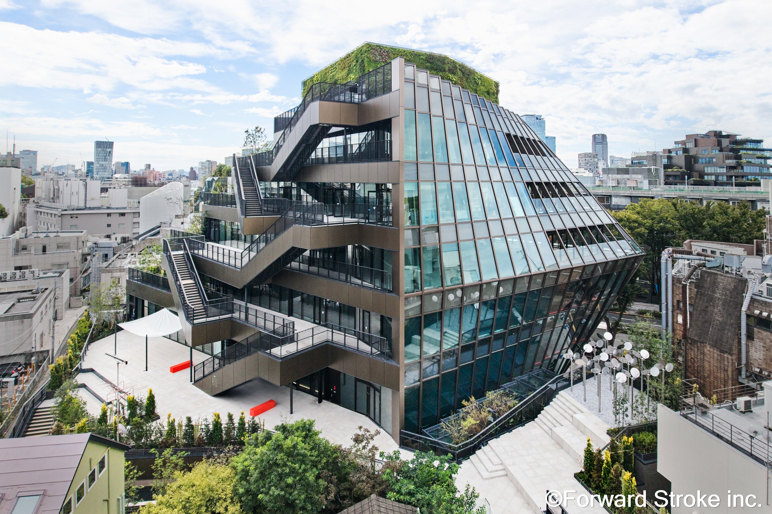 一方、個性豊かな路面店が点在する有機的でヒューマンスケールの街並みを持った原宿エリア/竹下通り側は、階段状にセットバックし街のスケール感に沿わせた横基調のファサードで構成されています。