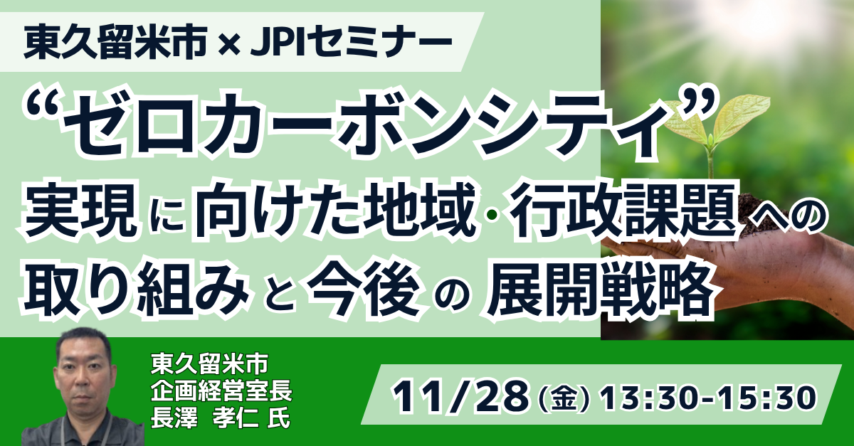 JPI(日本計画研究所)は、東久留米市 企画経営室長 長澤 孝仁 氏を招聘し、「ゼロカーボンシティ」実現に向けた地域・行政課題への取り組みと今後の展開戦略について詳説いただくセミナーを開催します。