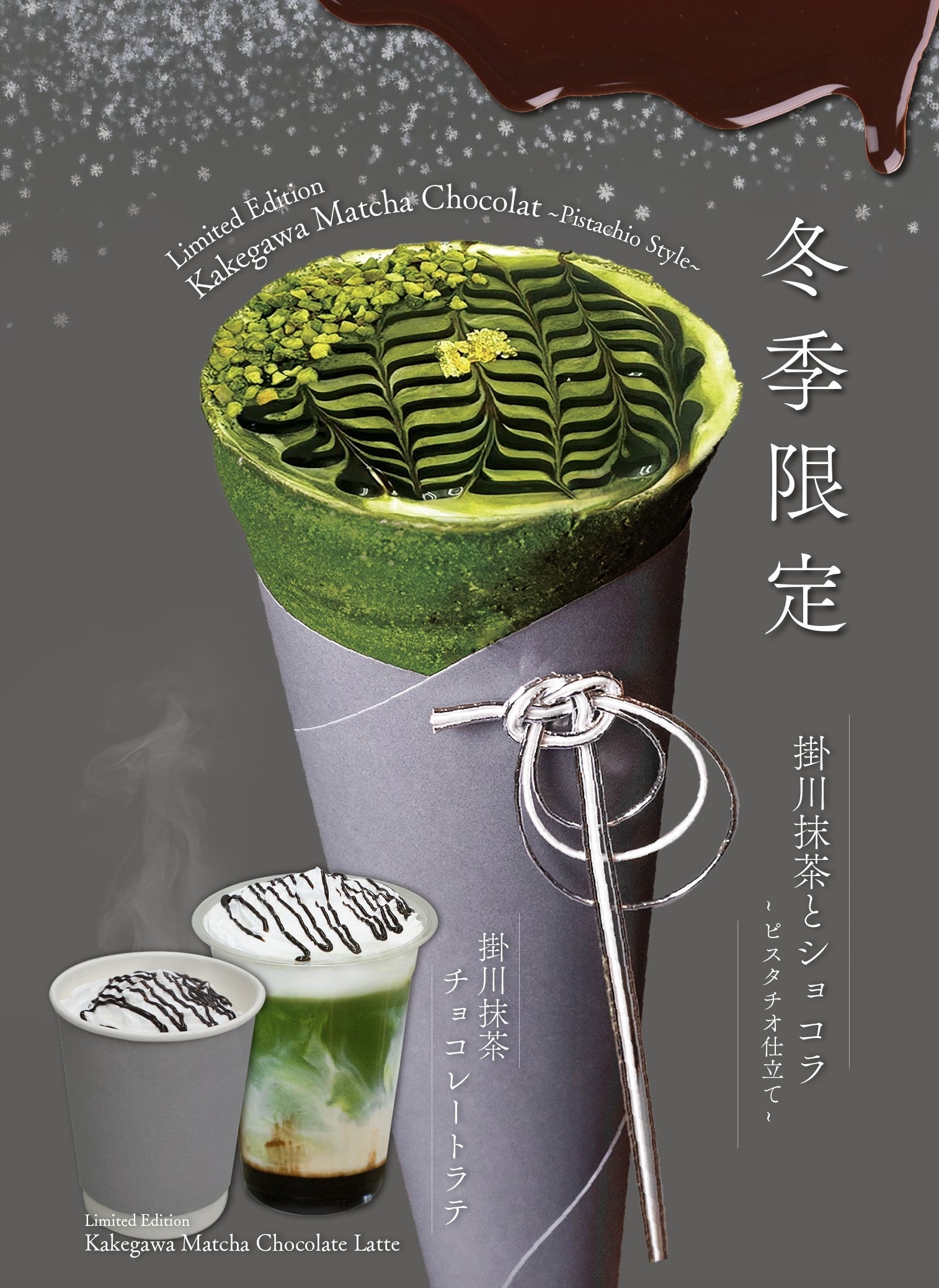 -冬の和クレープ-「和クレープ専門店 たばねのし(R)」より、12月3日(水)より冬季限定の和クレープ“「掛川抹茶とショコラ -ピスタチオ仕立て-」と冬季限定ドリンク「掛川抹茶ショコララテ」が新登場!