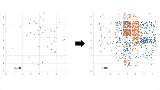 私たちは人間工学の分野におけるAIの社会実装のアプローチとして、少量の生理・心理データから人間の行動・感性・判断を予測・生成し、「人を再現」するシステム / サービスの提供に取り組んでいます。本デモでは、私たちのアプローチの背景や目的をはじめ、AIの具体的な活用事例としてGANの敵対的最適化を用いた「人間らしい」 複雑で曖昧な特徴の再現技術についてご紹介いたします。添付の図は、ノイズのように見える元データを拡張することで、少数のデータでは分からなかった傾向が見えている様子を示しています。