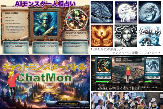 大阪・関西万博にも出展し大好評となった「チャットモンスターバトル」と札幌NoMapsでも多くの方に注目された操作不要で誰でも楽しめる「AIモンスター人相占い」が体験できます!最新の生成AIを活用し、一人で完結するゲームとは異なり、自然と会話が生まれコミュニケーションが広がるこの楽しさをぜひ体感してください!