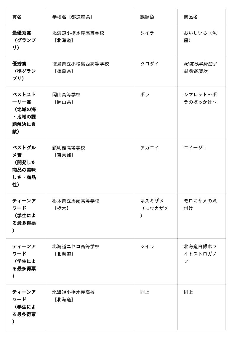 その結果、シイラを課題魚とした「小樽でとれたシイラを使った魚醤 おいしいら」を開発した北海道小樽水産高等学校が優勝しました。