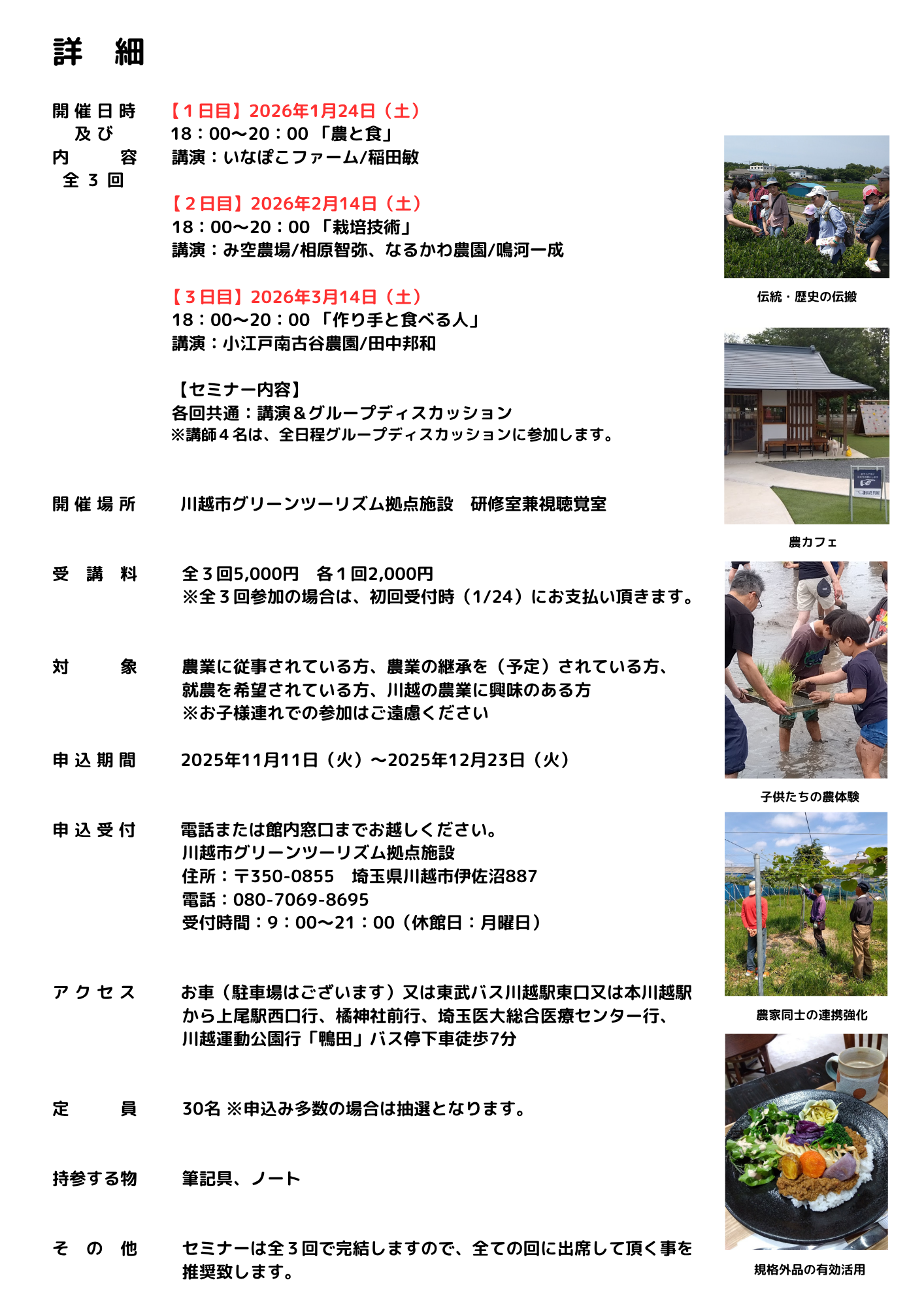 川越市グリーンツーリズム拠点施設にて、農業者・新規就農希望者・農業継承者のネットワーク作りや、農業者と消費者を繋ぐ農業セミナーを開催いたします。
