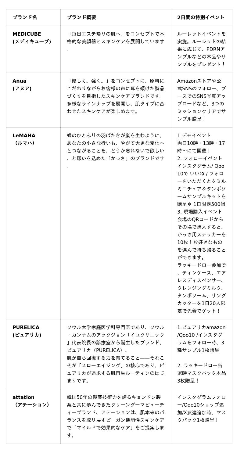 一年の中で最もお得な価格でブラックフライデーイベントを開催。ただでさえお得なベストセラー製品をポップアップストア特別価格で購入可能です。さらに、日本で人気の高いK-Beautyブランドのブースでは、5%から最大50%まで追加割引を受けられるクーポンをゲットできるチャンスも!