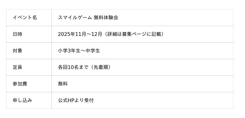 こどもサポート株式会社(東京都小平市)は、2025年11月~12月にかけ、「立川市子ども未来センター」にて、小中学生向け経営体験ゲーム『スマイルゲーム』の無料体験会を開催します。本イベントは、起業・経営・お金の動きを楽しみながら学べる、次世代リーダー育成の第一歩です。