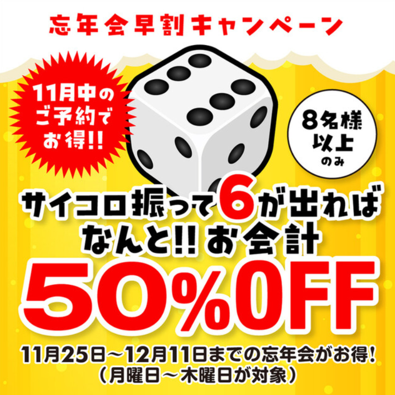 今回のキャンペーンは、8名様以上で全コースを対象に、サイコロチャレンジで「6」が出ればお会計が半額になるというものです。お洒落な空間で、お得に忘年会をお楽しみいただけます。