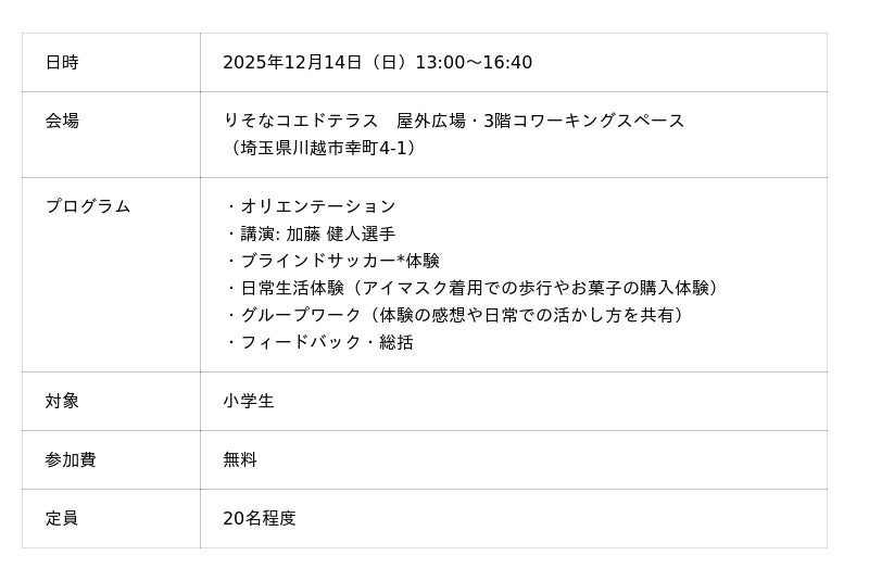 本イベントでは、ブラインドサッカーの元日本代表の加藤 健人選手の講演をはじめ、アイマスクを着用したブラインドサッカーや日常生活体験を通して、視覚障がいの世界を体感していただきます。親子で参加し、体験を通じて「違い」を受け入れる心や自己認知、夢や挑戦の大切さについて考える機会を提供します。