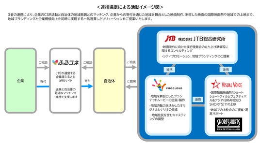 3者の連携とふるさとコネクト(自治体の地方創生プロジェクトと企業が行う社会貢献活動をつなげる仕組み)により、企業のCSR活動と自治体の地域振興施策とのマッチングから、地域を舞台とした映画制作、制作作品の国際映画祭出品や地域上映会の開催まで、地域ブランディングと企業価値向上を同時に実現する一気通貫したソリューションを提供いたします。