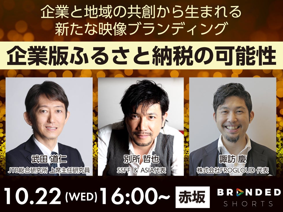 企業版ふるさと納税 × ブランデッドムービーで描く、新たな地域共創のかたちJTB総合研究所上席主任研究員、武田道仁氏、俳優でショートショートフィルムフェスティバル&アジア(SSFF&ASIA)代表の別所哲也、BRANDED SHORTSプロデューサーであり、映像制作を行う株式会社FROGLOUD代表の諏訪慶が登壇した本セミナーでは、「企業版ふるさと納税」と「ブランデッドムービー」をテーマにしたトークセッションを行いました。