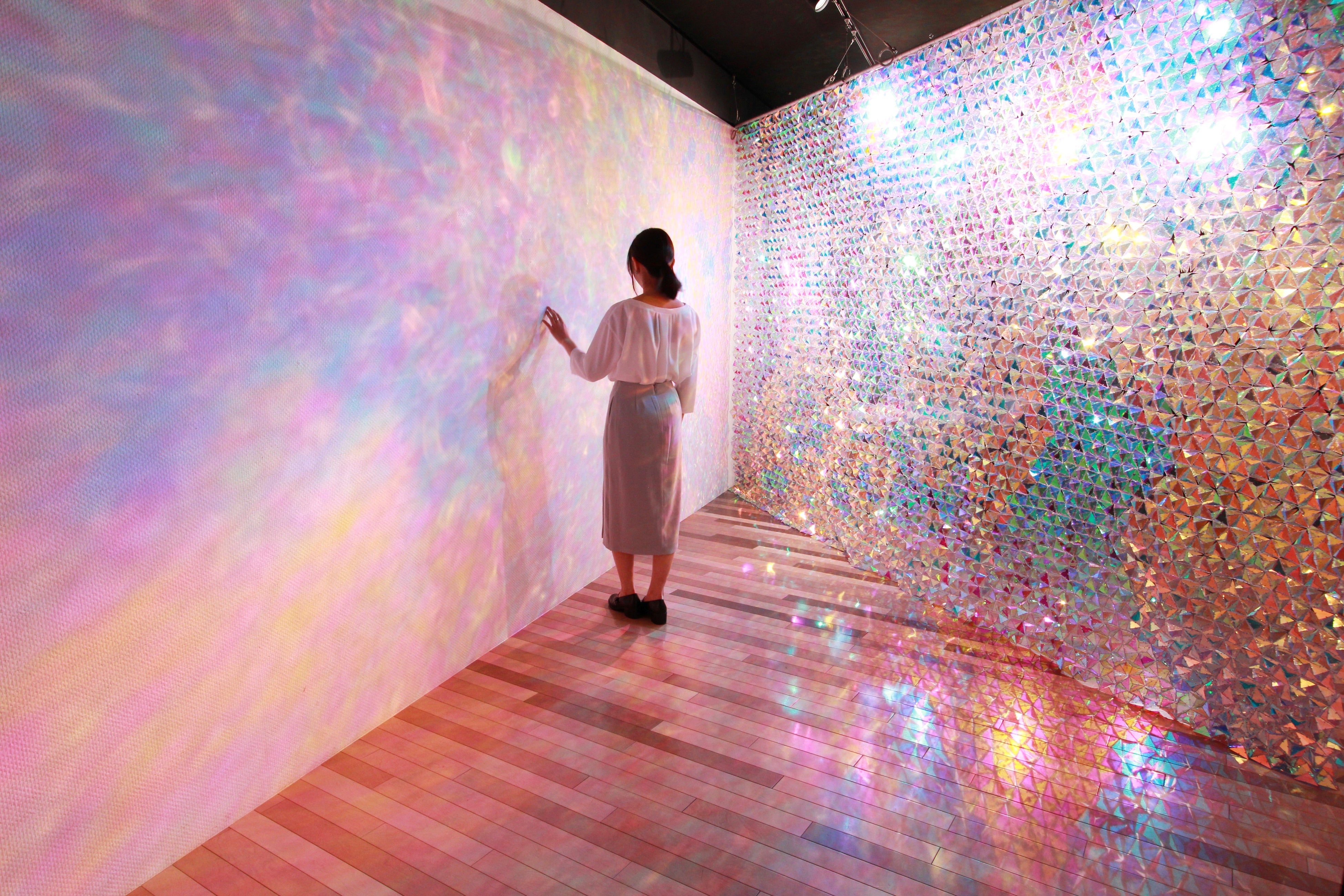 宇宙に漂う銀河の瞬き・自然界の光の現象にインスピレーションを受け、特殊フィルムと様々な素材・表面加工を組み合わせた構造色を用いて、立体作品・インスタレーションを制作しています。プリズムによって起こる光の屈折作用を応用することで、複数の色に分散された光の粒子が空間を支配し、見る者の造形意識を狂わせ劇的に視覚環境を変化させる作品制作に取り組んでいます。
