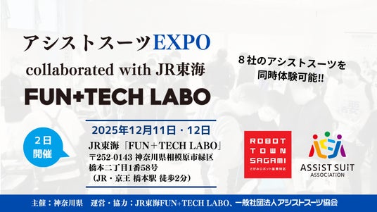 一般社団法人アシストスーツ協会(所在地:東京都中央区、代表理事:飯田成晃)は、神奈川県の「ロボット企業交流拠点」が設置されている「FUN+TECH LABO」(運営:東海旅客鉄道株式会社、以下、JR東海)と共同で、2025年12月11日(木)・12日(金)に「アシストスーツEXPO collaborated with JR東海「FUN+TECH LABO」」を開催します。