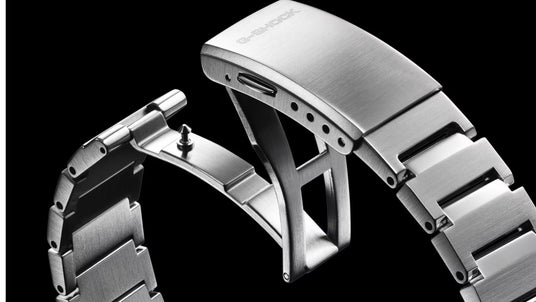GST-B1000のために開発されたステンレススチール製のブレスレットには、ヘアライン仕上げとミラー仕上げを施しています。新開発の三つ折れ式中留は、端正なデザインとホールドが魅力。控えめな佇まいが、手元に上質な空気を纏います。