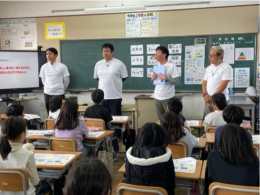 授業では、実際に大学で養殖されているブリの稚魚「モジャコ」を教室に持ち込み、子どもたちに公開。活きた魚を間近で観察することで、研究者が行う「育てる漁業」の技術と、持続可能な食糧確保の重要性を学びました。