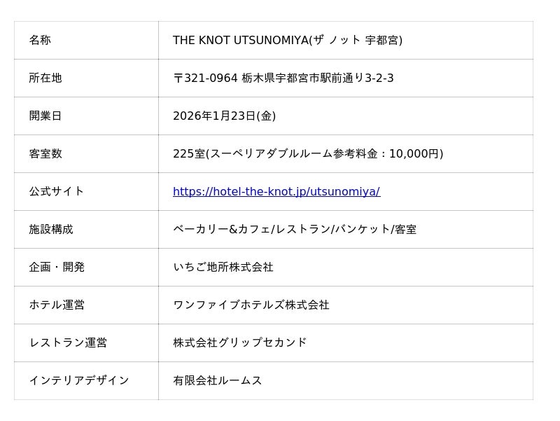正式な施設概要および取材案内は、2026年1月初旬に改めてお知らせいたします。宇都宮に新たな風を吹き込む〈THE KNOT UTSUNOMIYA〉に、どうぞご期待ください。