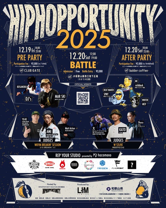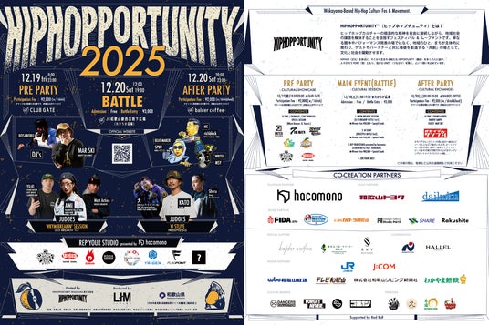 LIM LAB( 東京都渋谷区)浅井利哉(Tosy) が代表を務める、HIPHOPPORTUNITY WAKAYAMA実行委員会は、2025年12月20日(土)、JR和歌山駅西口地下広場(わかちか広場)にてヒップホップカルチャーフェス「HIPHOPPORTUNITY 2025」を開催いたします。