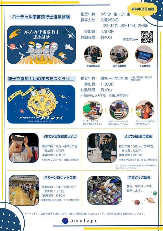 その他、宇宙グッズ販売など盛りだくさんの内容です。ぜひ、親子で一生の思い出に残る宇宙体験をお楽しみください。
